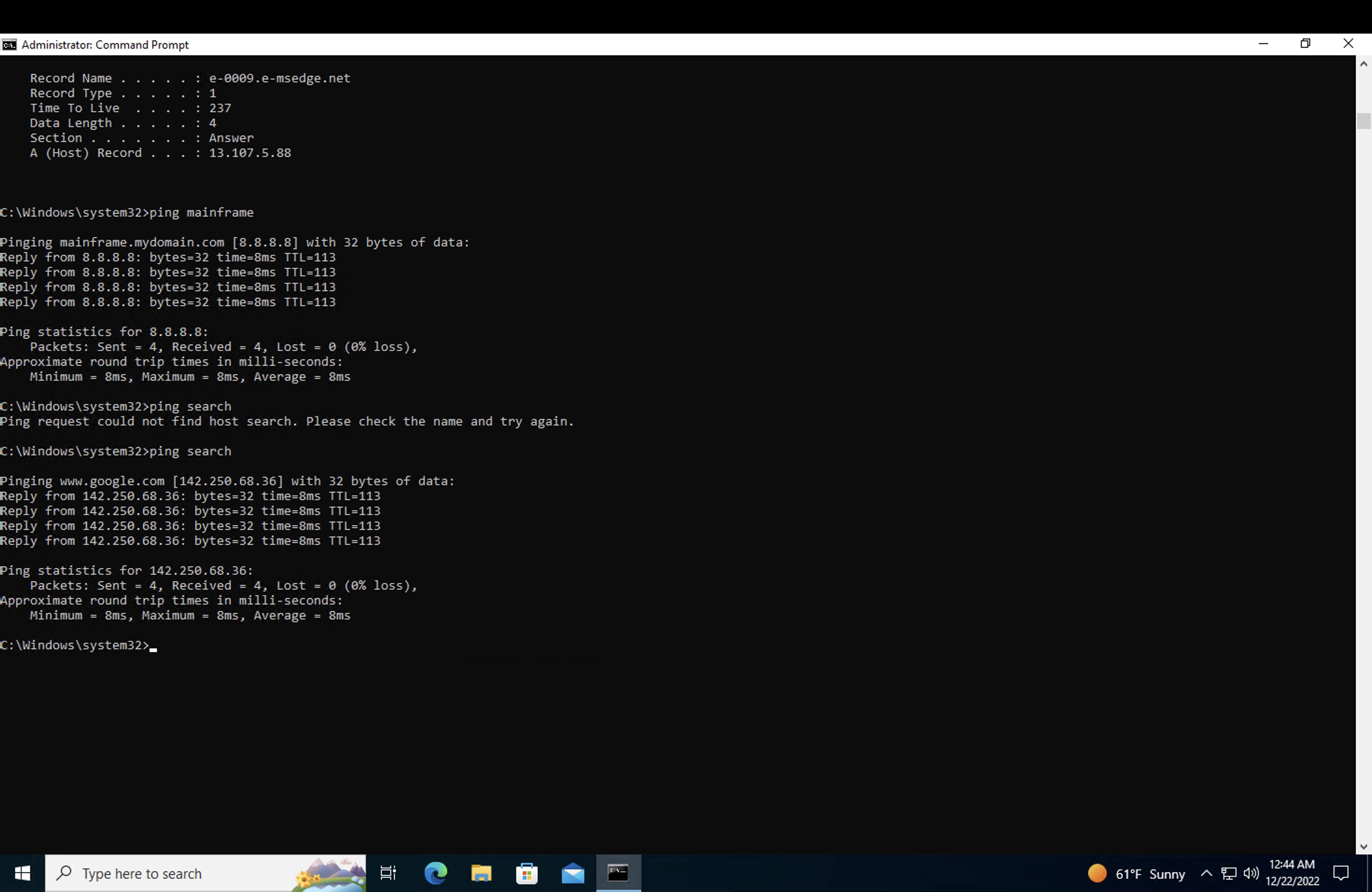 From here, type "ipconfig /flushdns". This will flush the DNS cache and the change to mainframe should now show. Then type "ping mainframe" and it should now show mainframe's new IP address of 8.8.8.8.