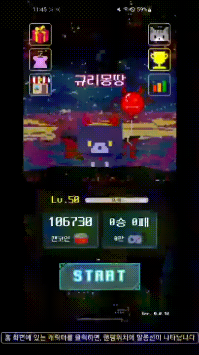 | 사용가능한 공격 아이템이 있다면 공격 버튼이 활성화됩니다. (공격 시 1초간 진동으로 알림이 발생하고 참치캔이 날라갑니다.) |