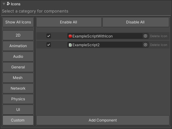 Icons for custom Monobehaviours or Non-UnityEngine types have their own tab and toggles so they can be added.