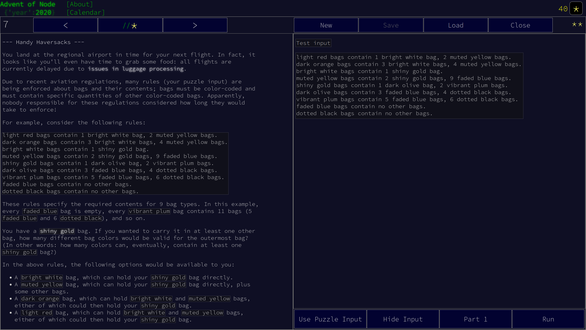 . The user can open a puzzle to read its description and test their solution using either their puzzle input or a custom input entered on the right side of the UI. Custom inputs can be added, saved, modified, renamed, etc., and are also stored in Mongo alongside the user's provided puzzle input.