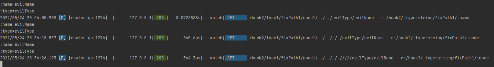 For regex route/book2/:type:string/fixPath1/:name,urls below can match and value of:type:namecan be replaced with evil value.