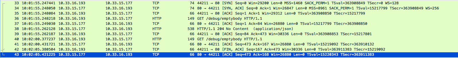 I've captured a tcpdump of the issue (the first request is executed at 10:01:55, the second one at 10:02:00):