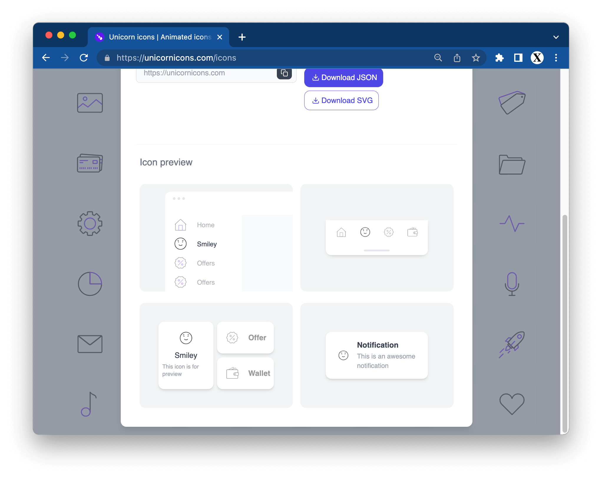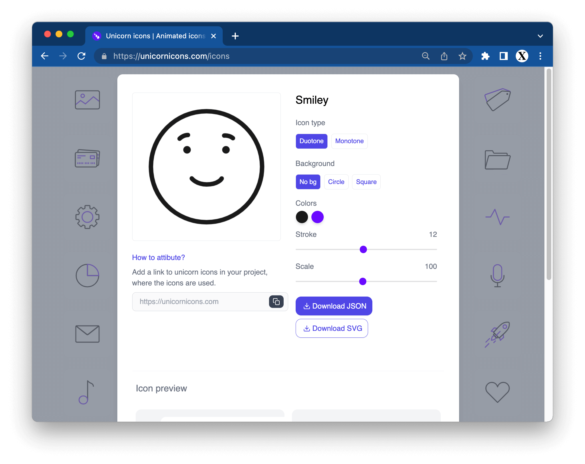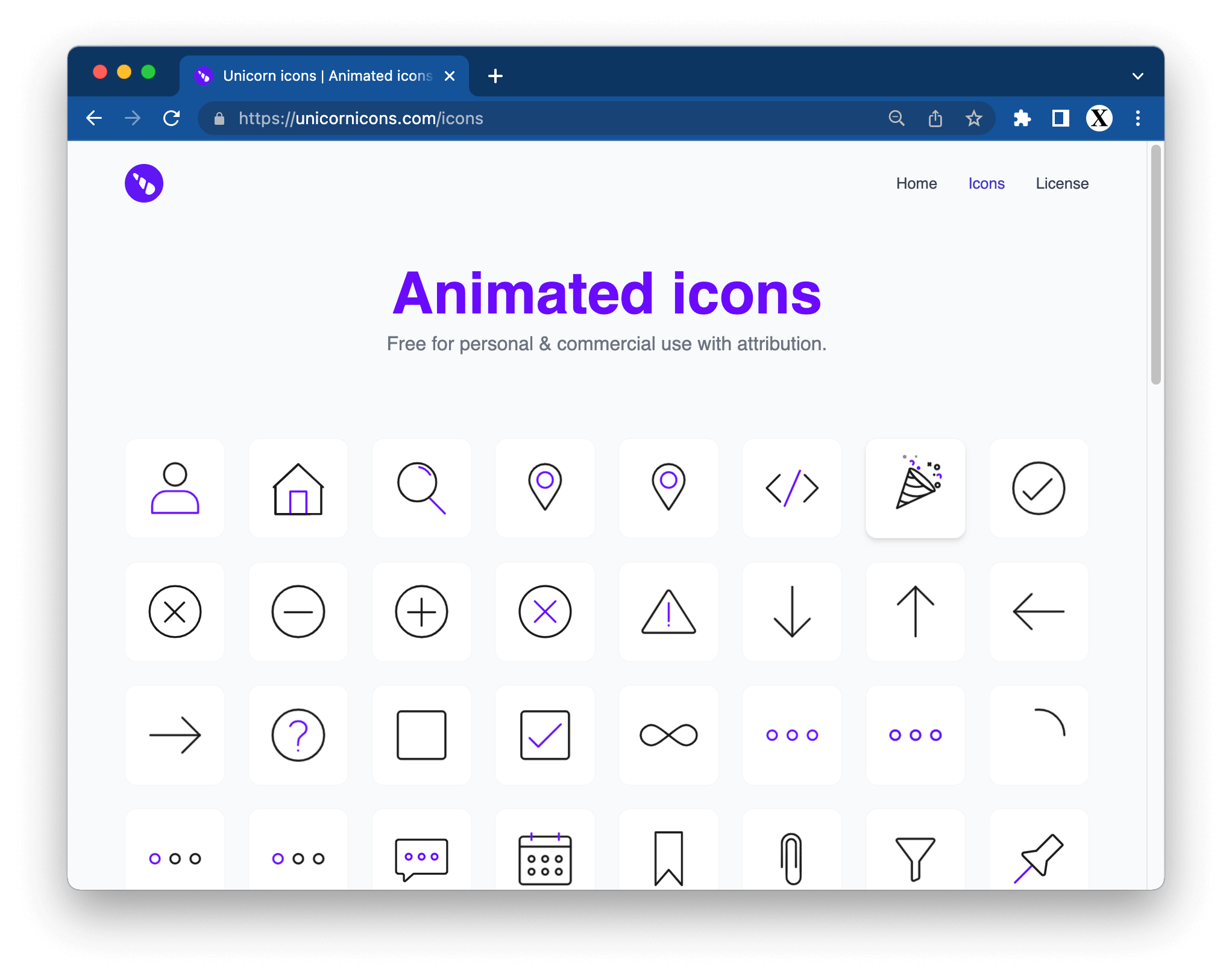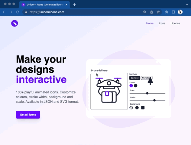 带动画效果的免费图标库,可以自定义颜色、背景色、线条粗细、大小等。支持下载 JSON 和 SVG 格式文件。