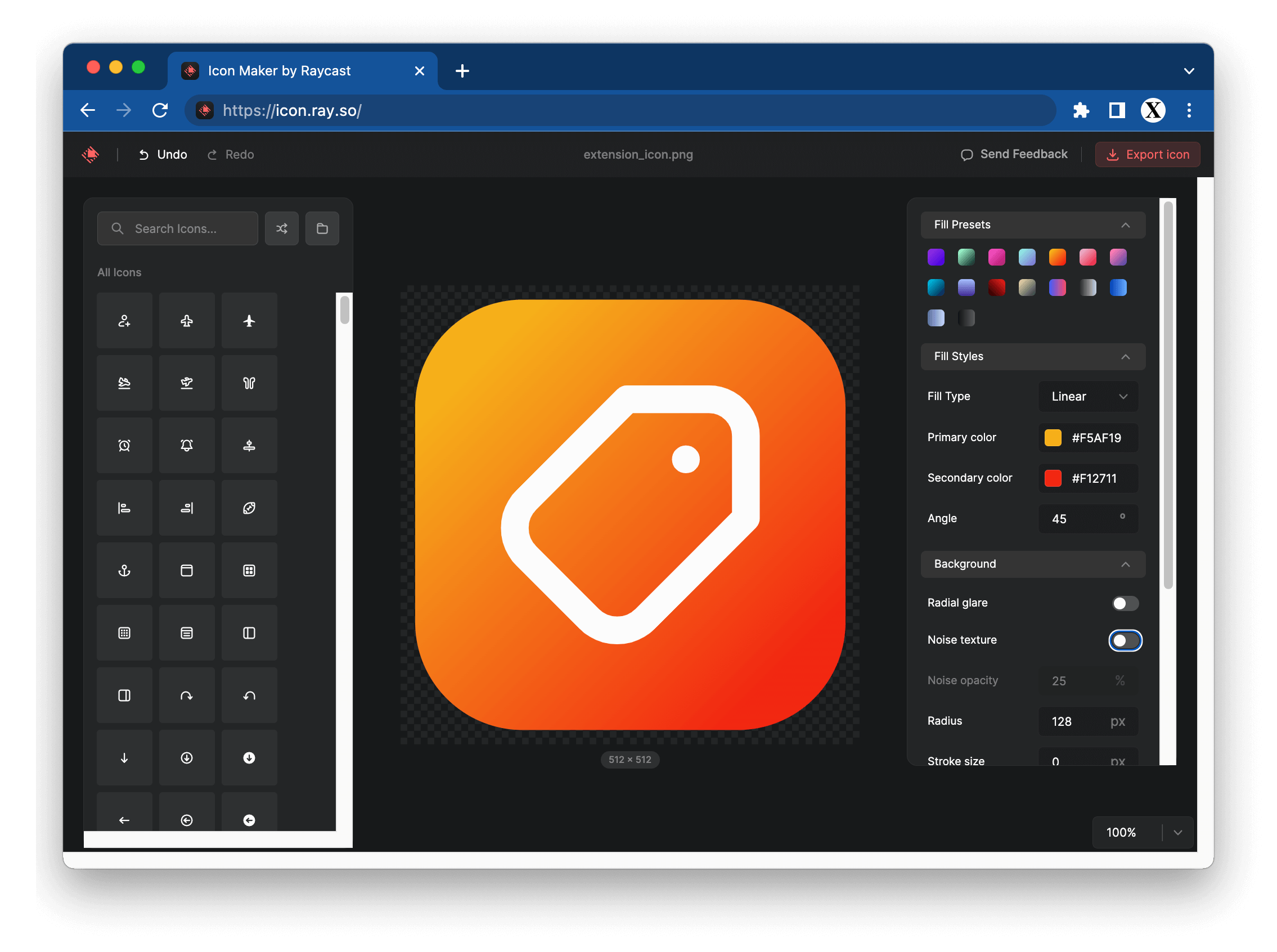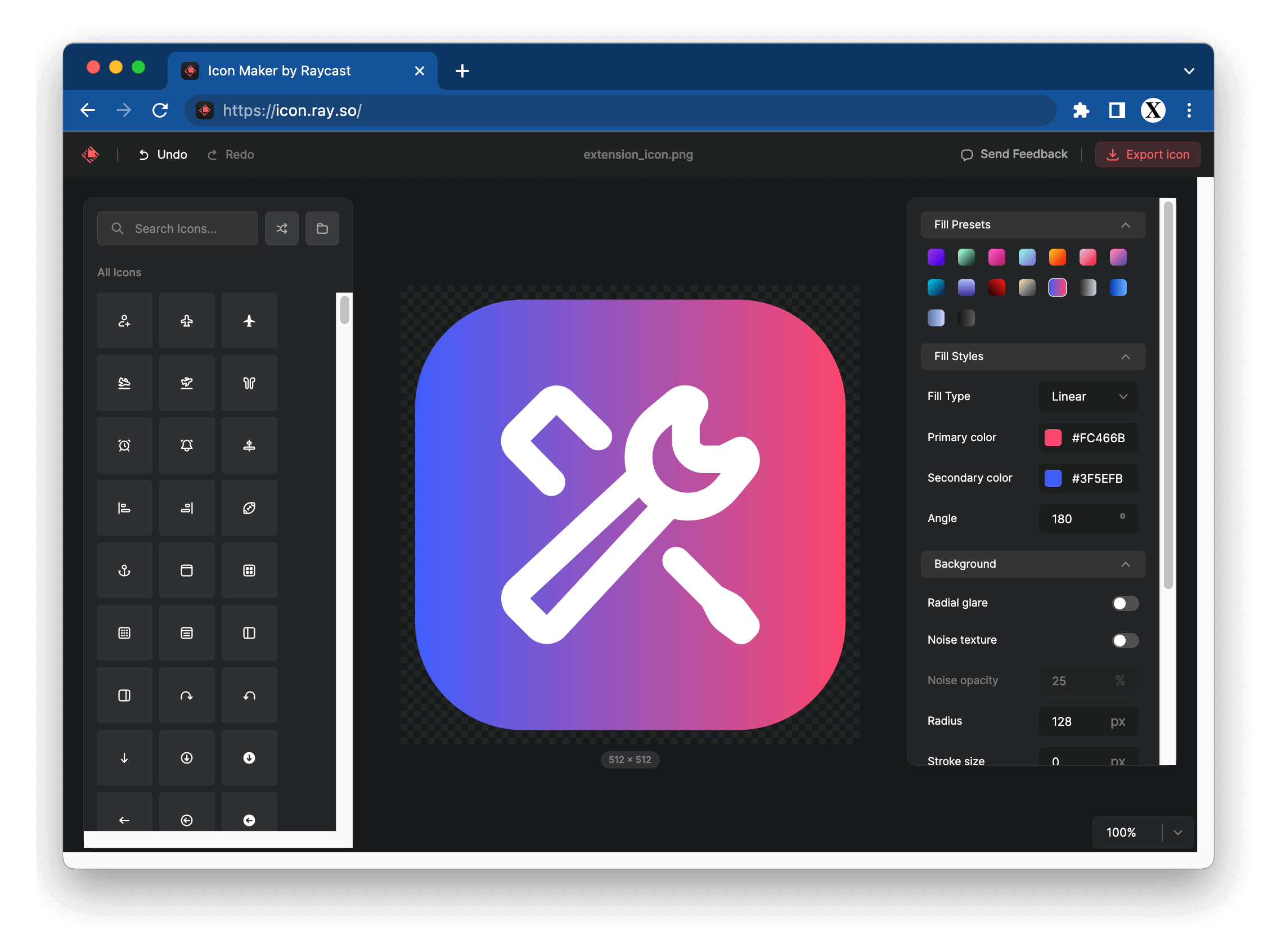一款快速制作漂亮的应用图标的在线工具。从提供的 icon 中选择或上传 svg 文件,设置背景,即完成图标制作。支持同时下载各种大小的文件,非常实用。