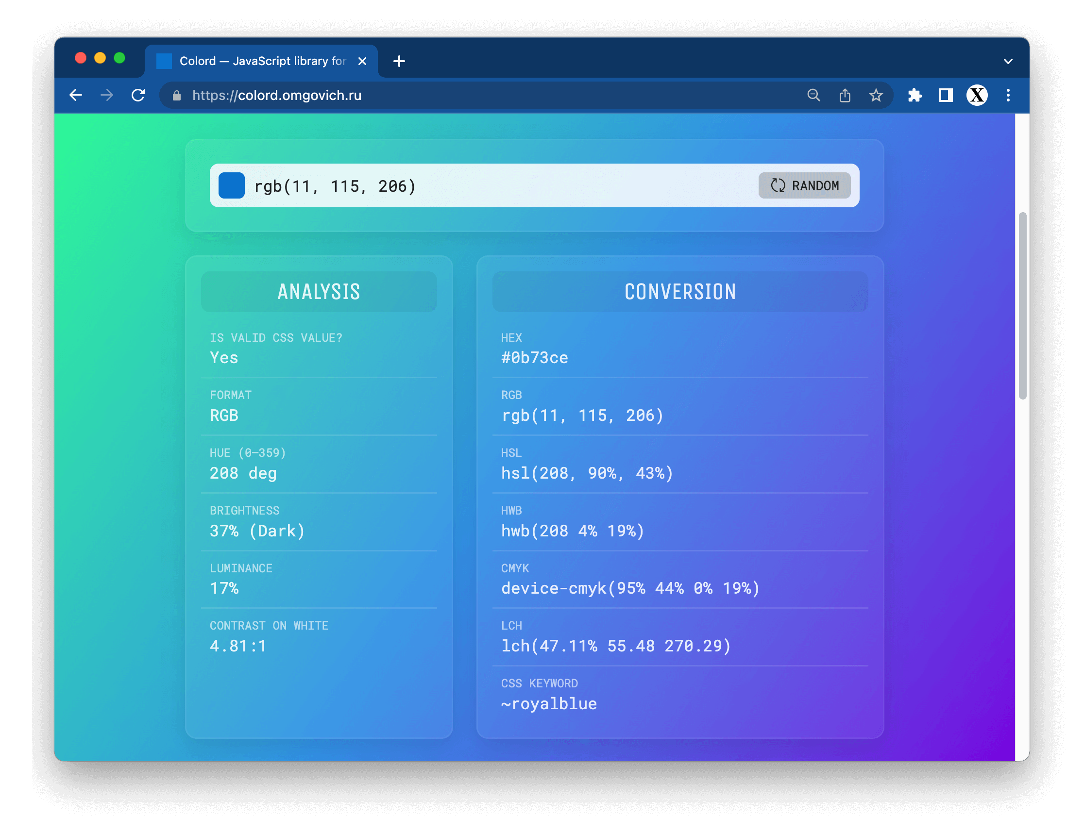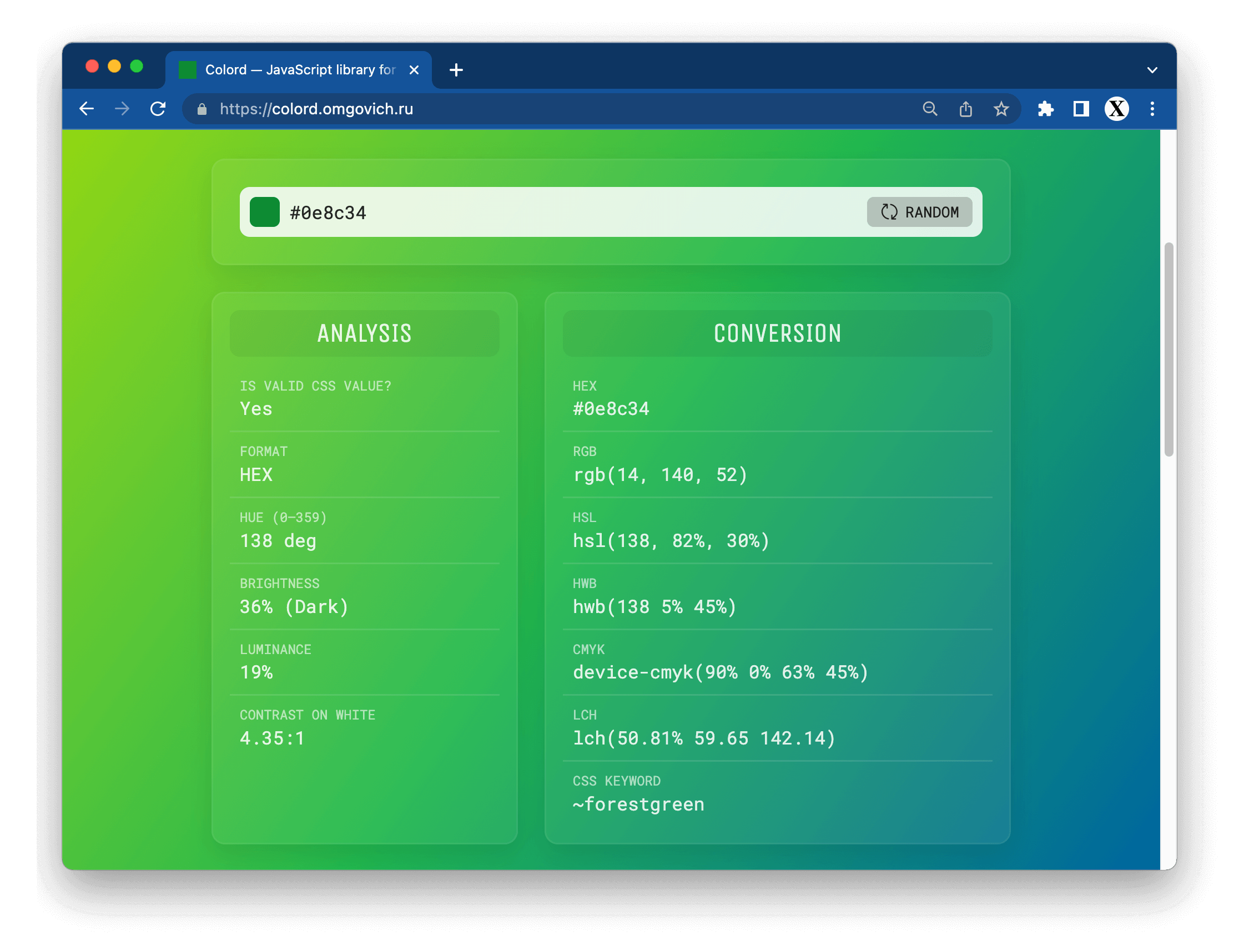 一款在线颜色代码转换工具。colord 是一个高性能颜色转换 JavaScript 库。