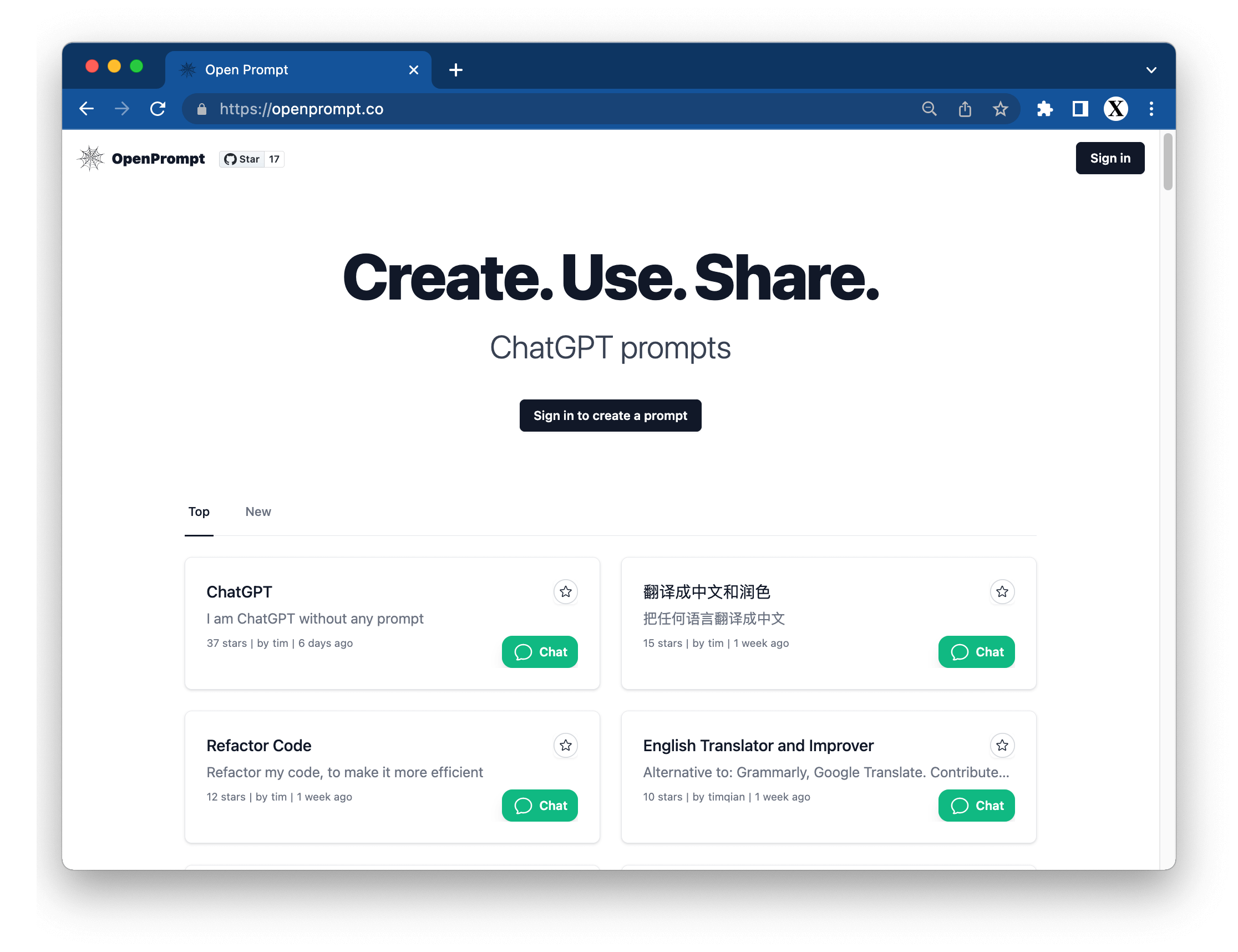 Open Prompt 是一个在线工具,可以创建、分享和收藏 Prompts。更多介绍可以看这里。