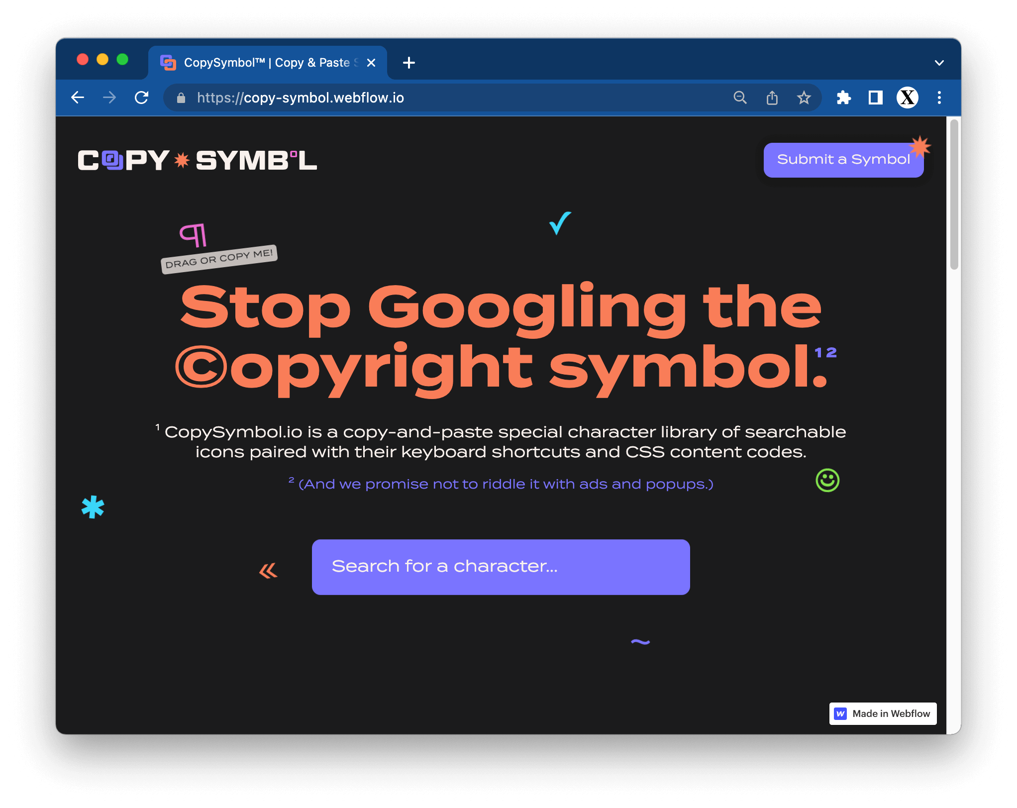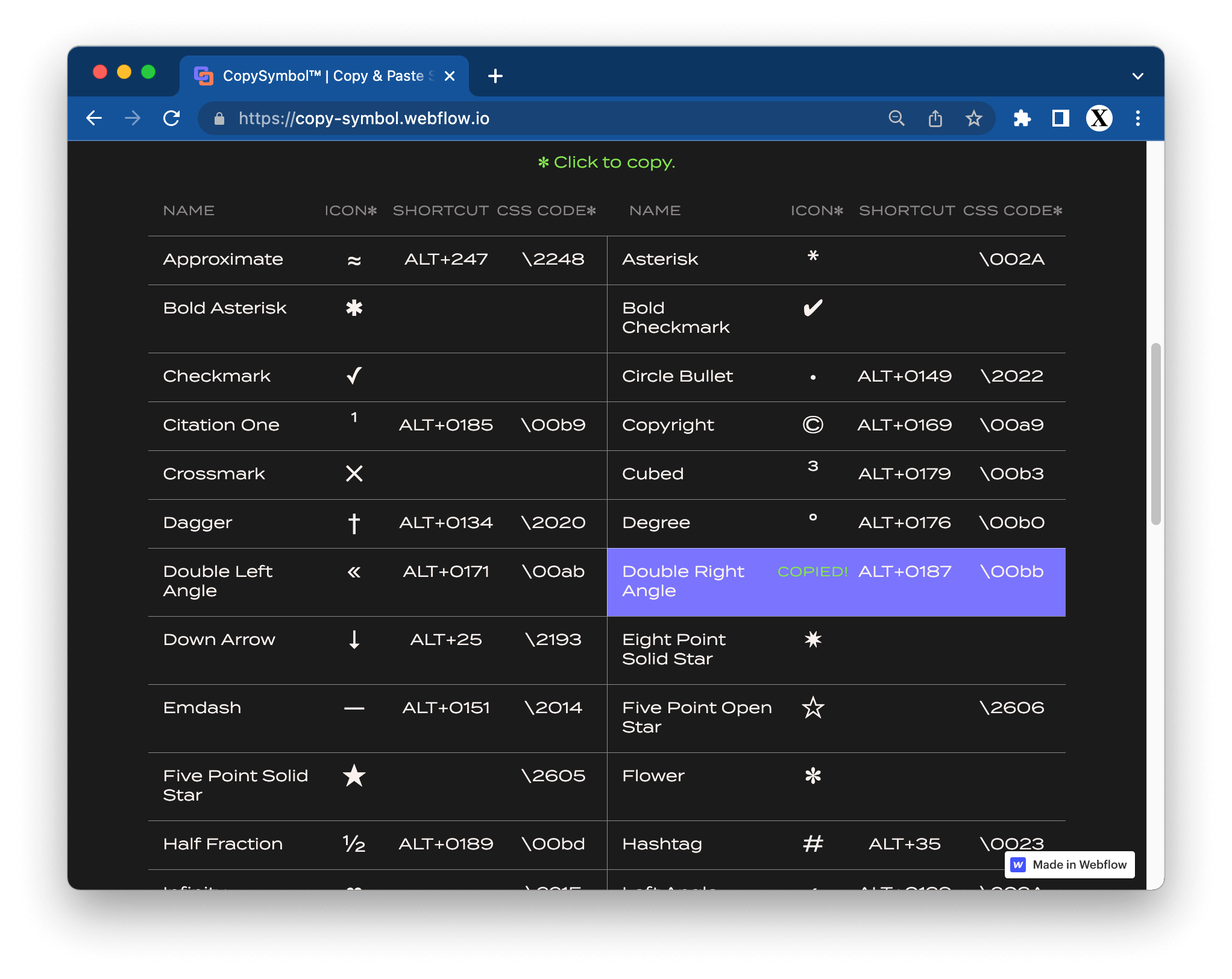 这是一款简单的工具,可以帮助你复制各种符号。它还会告诉你输入这些符号的键盘快捷键和 CSS content codes。