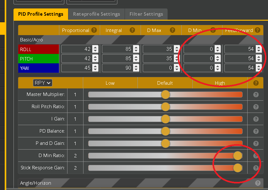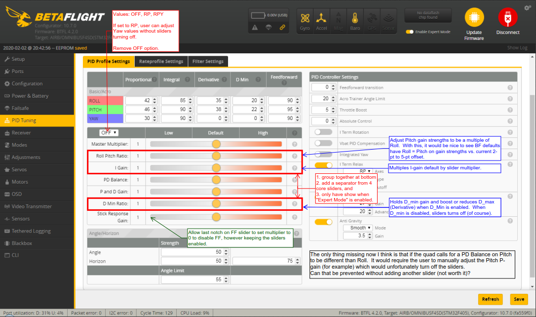 Thanks @mikeller i have start testing now. I can see that after move some sliders,PITCH value for p,i,d and f goes to wrong values, also after this if you want to put sliders on 1, never goes to default values. In the other hand, seems that disabling-enabling Dmin doesnt have efect on D values yet. |