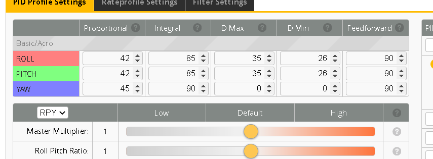 @mikeller , agreed. The user base - in general - loves the sliders and the option to still type in what you want is key. As they are transferred from Configurator based to Firmware based we just need to keep an eye on CONSISTANCY of how they work! Something to consider is hiding the new sliders unless "Expert Mode" is toggled in the configurator. I would not worry about that type of thing in the OSD sliders, just the configurator. But that is something that can be looked at in the new PR. Removing the sliders or altering how the current sliders work in form would cause an uproar IMHO and it would be hard to defend the "BF is too complicated" complains that would follow. Mspatz First, as the slider goes higher it makes PD ratio lower, not higher. Also it does not align with the fact that you tune in this order ... Filters -> D -> P-> I-> FF. For optimal wash performace, you want D as high as you can - just below the oscillation point - and then balance P off of it. And then on to i-Term, etc.... So in the current code, every time you change the PD Balance slider you have to typically tweak the P & D Gain slider too. In Configurator 10.6, that was not the case (by orignal deaign). Alas, I argured against the change back when it was made from 10.6 to 10.7 and failed; I'm not sure the majority agrees (yet) but hope a couple vidoes since has changed some minds (if anyone even watches); and reverting back to the better behavior does go agains my conaistancy argument. But rest assured, if it would be UAVflight, it would be the other way to be LESS complicated.] |