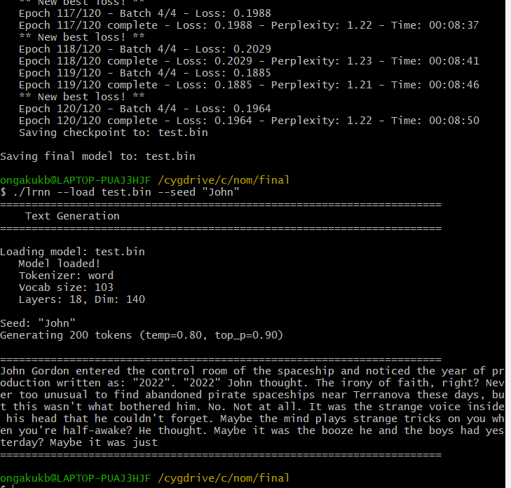 You likely need VERY good CPU (Ryzen/i7 etc.) and corpus of hundreds of KBs+ and hours/day time. For word tokenizer you'd need perplexity of 1.2 or less and validation loss under 1, for character tokenizer the perplexity may need to be as low as 1.05 (cruel but true... - yet unironically possible with this program). Ideally try with --word tokenizer as with --character tokenizer you need very, very low perplexity reached to avoid gibberish words, but the flip side is that character tokenizer reaches lower perplexity much quicker than word-based one. Oh and btw: you can try to program BPE-tokenizer - serious feature currently lacking, for production!