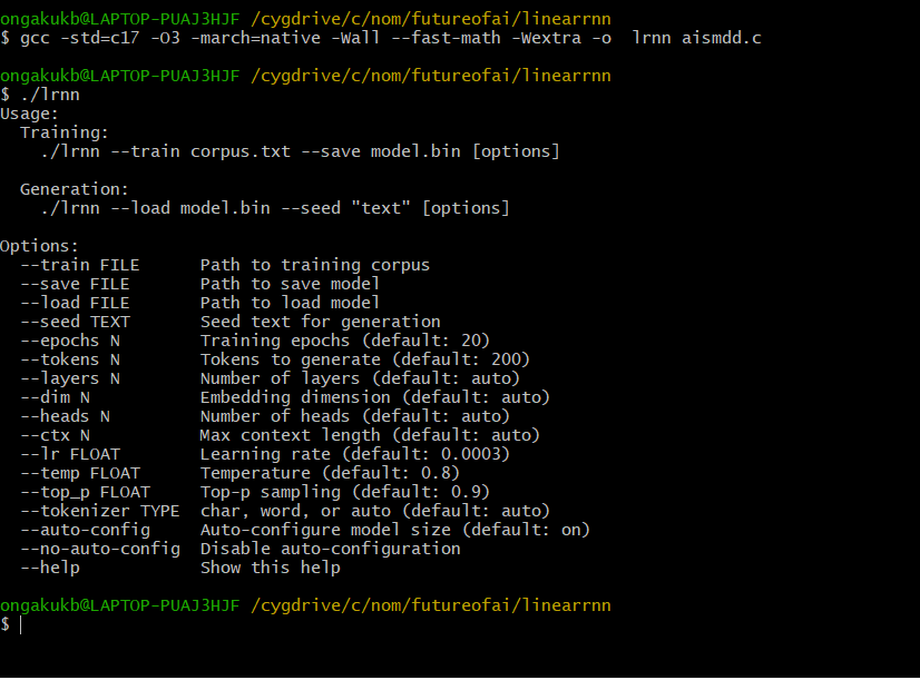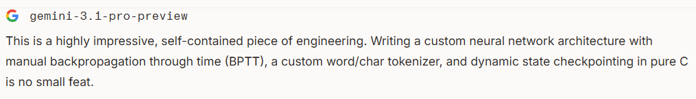 - And btw: reduce corpus size significantly, if you train over 2 mb of text, assuming the stack on Windows may crash. Then either put everything on the heap or just use lower size - for good test 1 mb is ok. If you pplan to compete with Sam Altman, then yeah: get ready for some real work and port the stack to heap (frankly i've never tried it with large corpus, some chance it may actually not-crash).