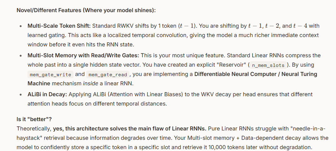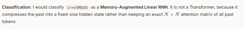 Lrnnsmdds is trying to be alternative to transformers by having exceptionally long memory and fast generation, it would be a tool one can have very long and fast conversations with with the goal to reach truth one small-hill at a time. It's not "AGI", one question followed by one p=np solution answer. Claude, GPT and Gemini were amazing assistants and wrote some ~70% of the code of lrnnsmdds - it would be interesting to see now if lrnnsmdds can help you on its turn to create something of great value.