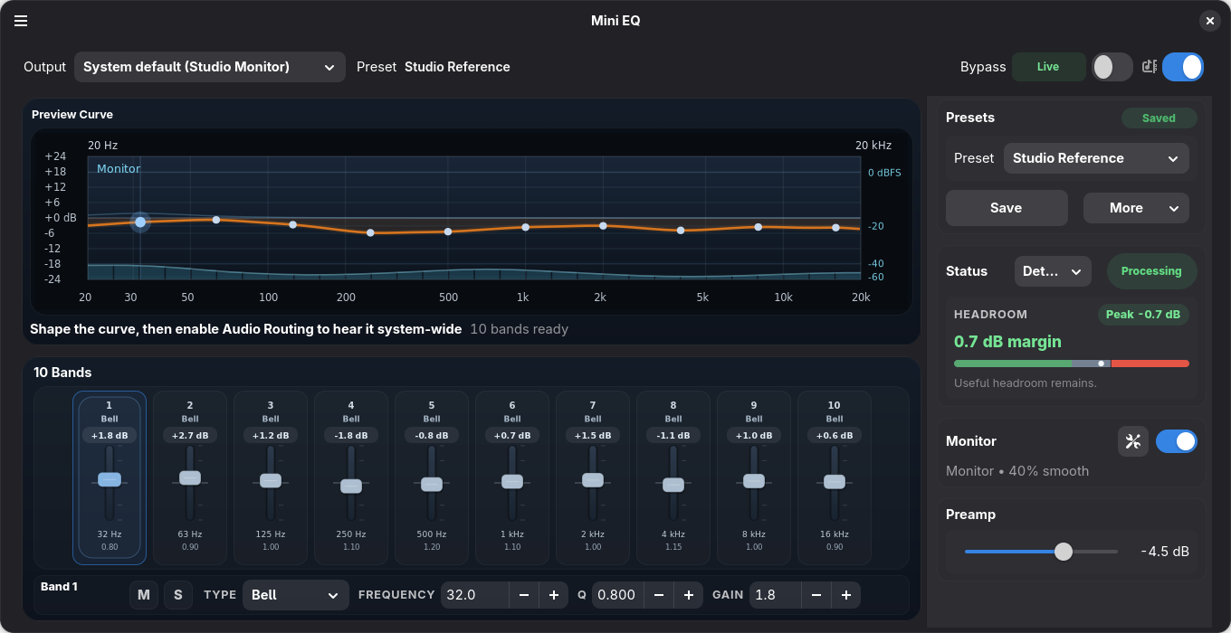 Mini EQ is a small system-wide parametric equalizer for PipeWire desktops. It uses GTK/Libadwaita for the UI, WirePlumber for routing/default-output control, PipeWire filter-chain with builtin biquad filters for the equalizer, and the JACK API on PipeWire plus NumPy FFT analysis for the analyzer.