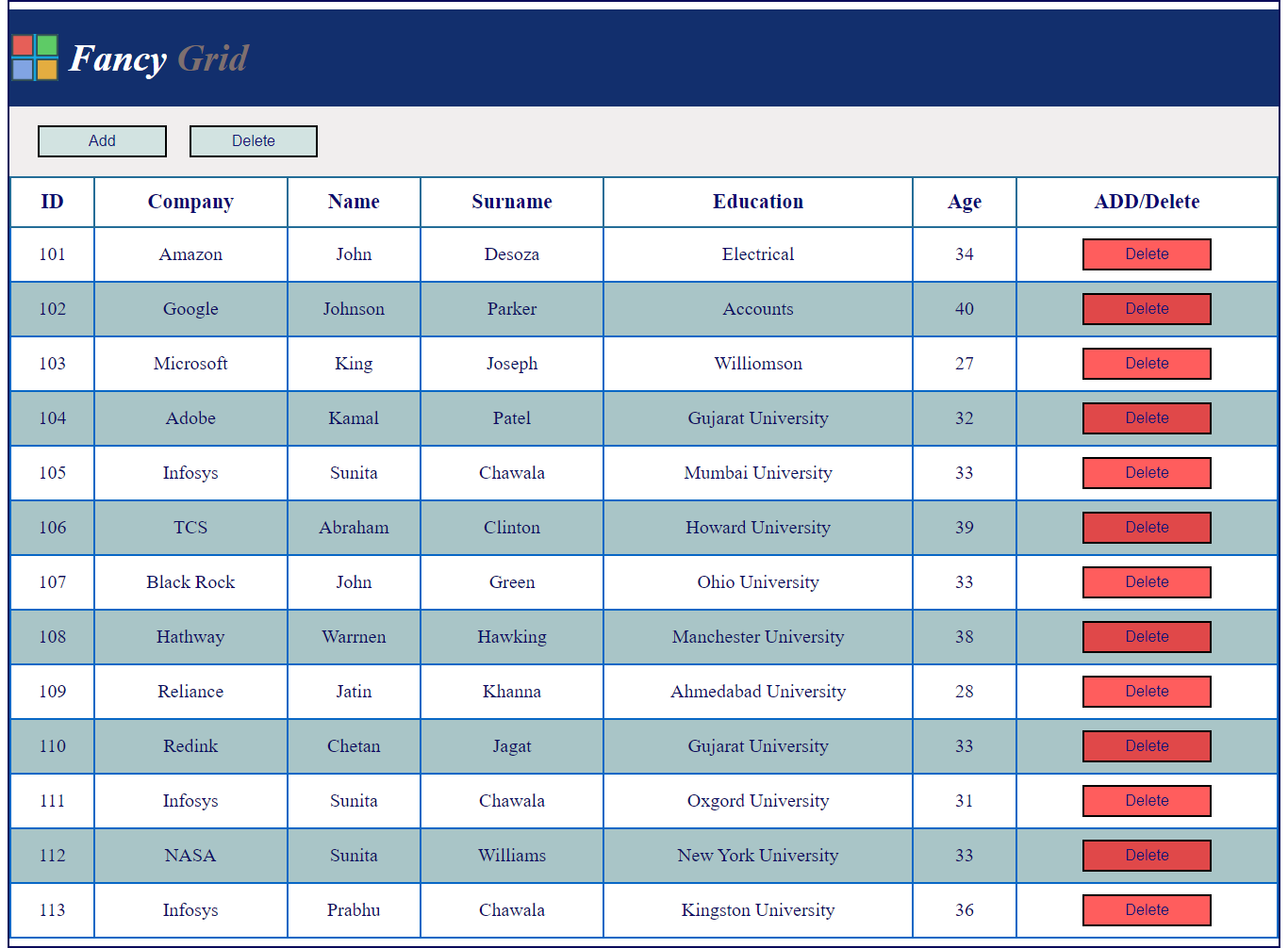 A table design using HTML and CSS, using <table>, <tr>, <th> & <td> tags.