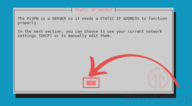 - The next screen explains that you will need to set up a static IP address for your VPN. This is so that when the Raspberry Pi is restarted, it will try and use the same IP address. If the local IP changes, you could potentially lose access to your VPN.