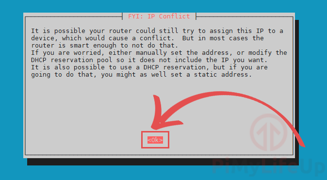 - This screen warns you that there is a chance your router will assign the IP address to another device.