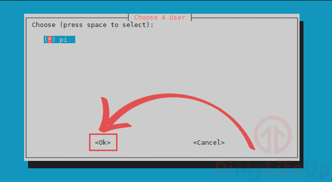 In this tutorial, we will be making use of the pi user. If you want to use another user, use the ARROW keys and SPACEBAR to select it.