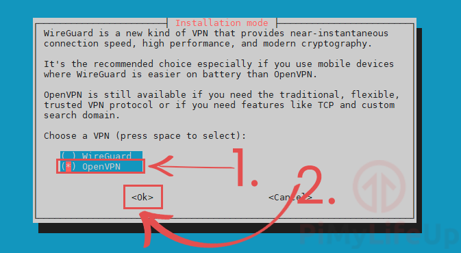 - You will now be asked to select what type of VPN you want to install on your Raspberry Pi. The two choices are WireGuard and OpenVPN.
