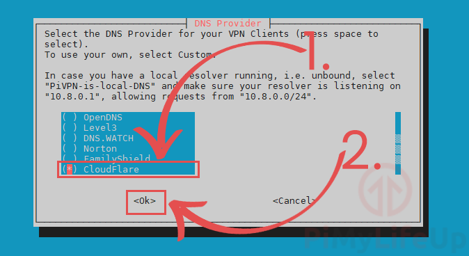 To select Cloudflare or another DNS provider, you will need to use the ARROW keys (1.).
