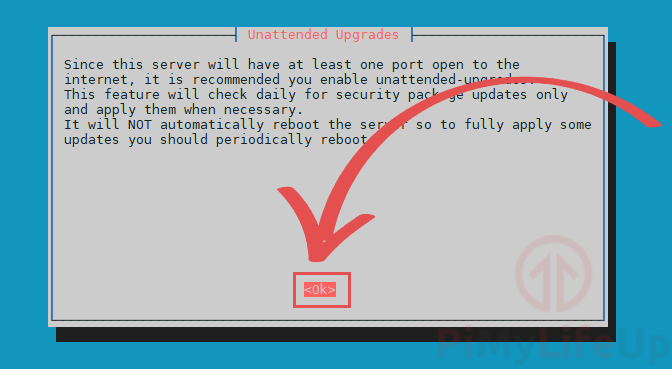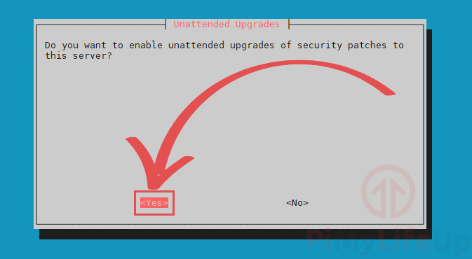 - On this screen, we highly recommend that you enable unattended-upgrades by selecting . Enabling this will ensure your Raspberry Pi should always have the latest packages.