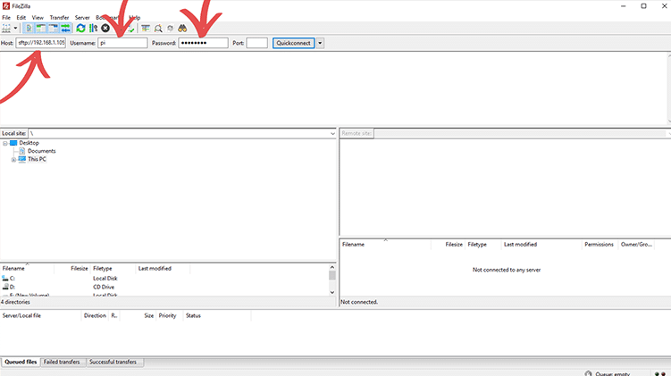 To get started, let’s log in to our Raspberry Pi over SFTP. Remember to type sftp:// in front of your Raspberry Pi’s IP address.