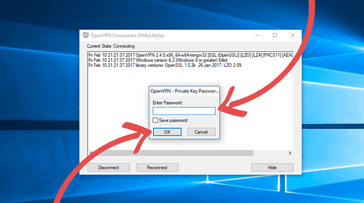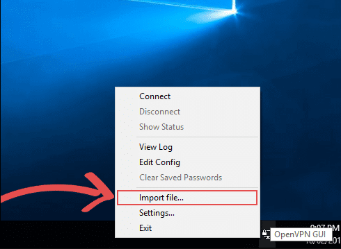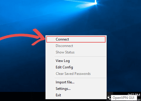 - Now right-click the OpenVPN client icon in the taskbar again, this time click the “Connect” button.
