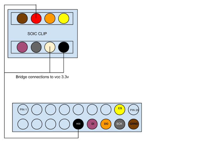 Note: The raspberry pi 3.3V rail should be sufficient to power the chip during flashing, so no external power supply should be required; however, at the time of writing that has only been tested and confirmed for one chip, the MX25L6405D.