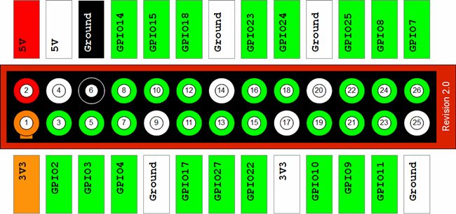 Diagram of the 26 GPIO Pins of the Raspberry Pi Model B (for the Model B+ with 40 pins, start counting from the right and leave 14 pins):