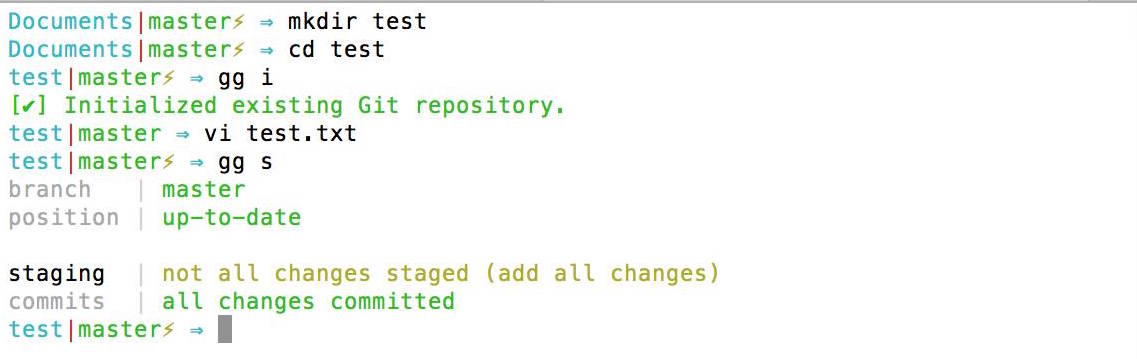 For example, the gg s command presents you with an easy to look at a quick glance status of your repository. In addition, there are aesthetic changes that increase the intuitiveness of Git itself.