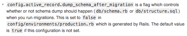@neerajdotname The db:migrate rake task runs dump at the end which dumps the database structure to schema.rb file. It is useful in dev env, but not required in staging or production env, right ? By default, it's value is set to true.