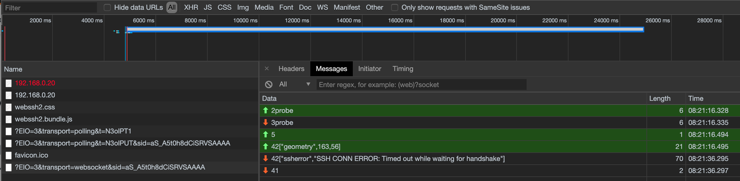 @Mierdin for whatever reason the changes you have don't seem to be compatible with the build of the web client that's in your branch. I get this in the console.log: Chrome devtools look normal to me, don't see anything glaring there. So it seems like the socket is getting established, but it doesn't seem like the ssh connection is happening properly perhaps... If i check out commit 2289036 which seems to be the version of master you started with, everything seems to work properly... I also have some conflicts in the most recent master, but I can resolve those. Could you check out a "fresh" copy of your PR and test against the native client and let me know what you see? |