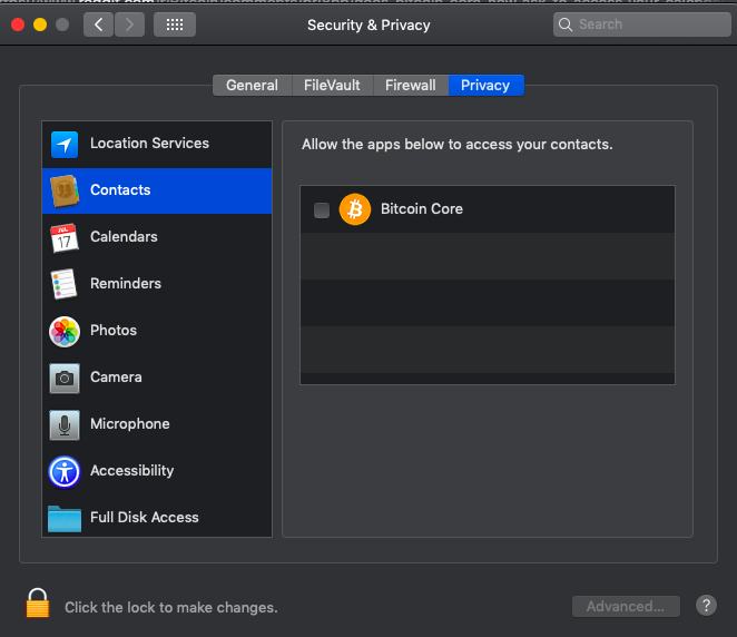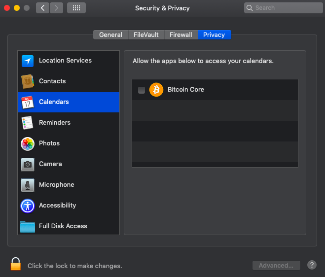 Bitcoin Core 0.18.0 requests access to Contacts.app and Calendar.app on macOS Mojave from a new installation on a formatted machine.