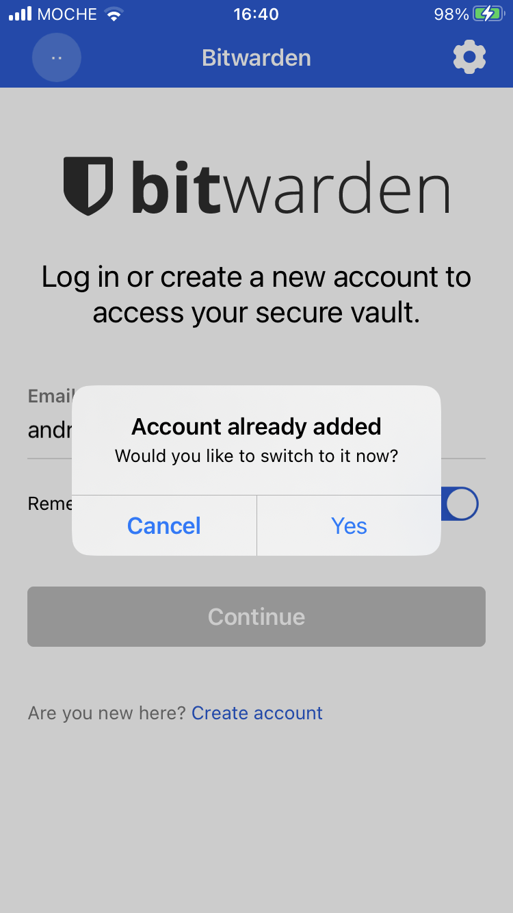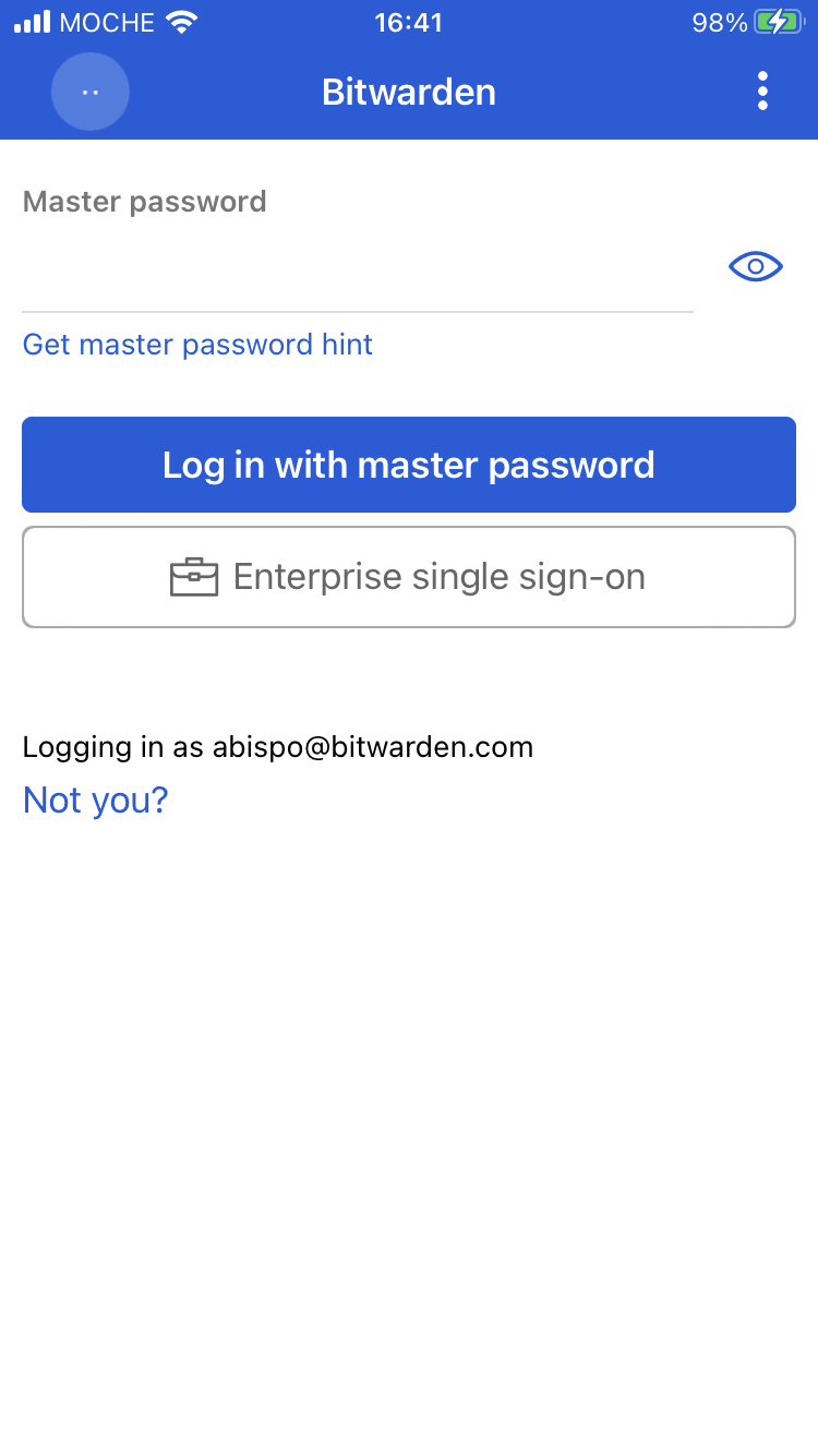 If your account is set to logout on vault time-out, once your vault times out, if you click on “not you?” from the master password screen, the app crashes.