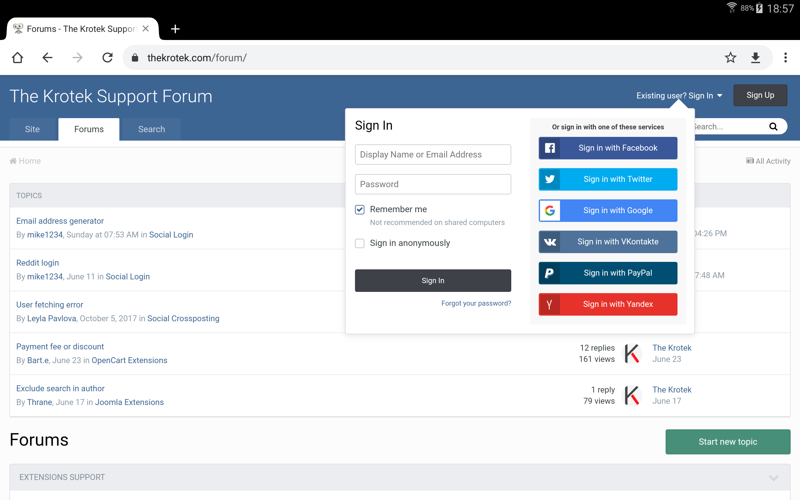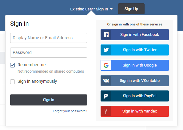 ➡️ Example of login using OAuth (right), in this case with a lot of choices because on a support forum of a website selling ... an OAuth module for a known CMS and a popular forum system (and using it as a proof of proper functioning on its own website and forum).