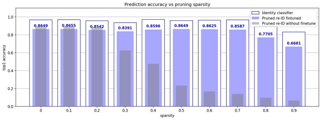 Note: remeber to keep the prefix, batch size, learning rate, decay steps arguments same as the initial baseline training. The finetuned model with highest validation accuracy will be saved as ./checkpoint/MaskDenseNet121-market-bs+32-lr+0.1-ds+40/ckpt-prune-sp+0.5000.pth. (Note: without "-init" in the name)