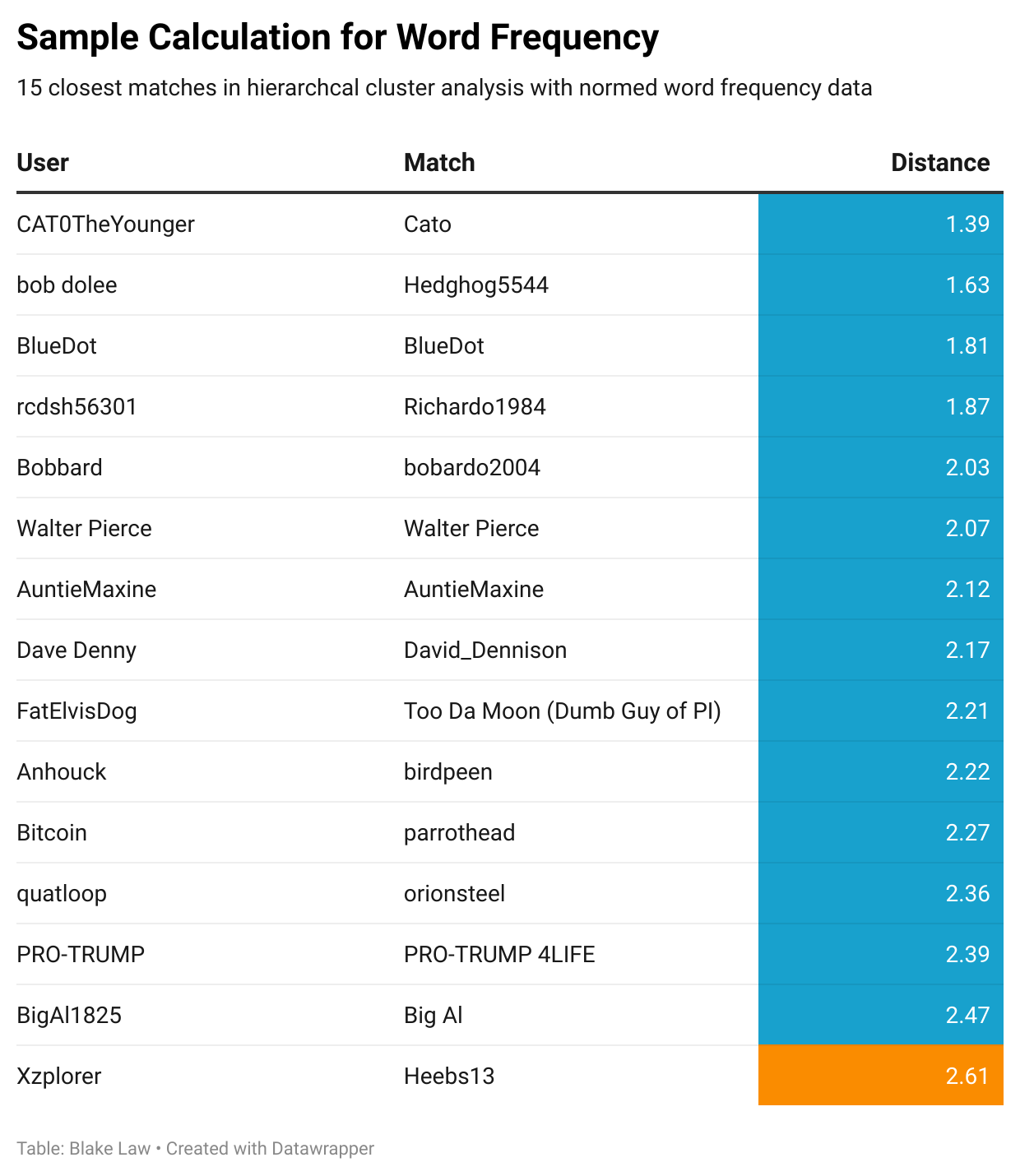 In this chart, blue represents a match, while orange represents no evidence of a match. Note that when it matches users with the same exact name (e.g. BlueDot and BlueDot), these are not the same account. This occurred because the user made a new account and had similar word frequencies to their previous. Thus, the lower bound for accuracy in this method is