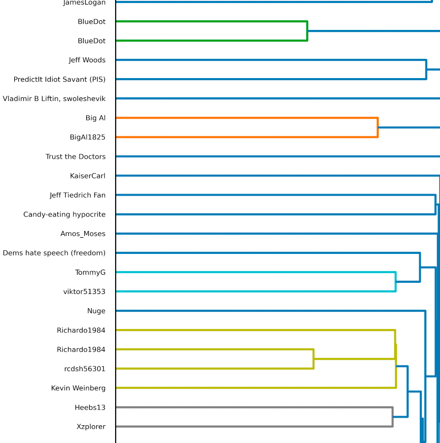 Sample Calculation: Running process_linkage(C1, LB1).head(15) in Dendrogram.py yields the following table. It has been annotated to denote known alternate accounts: