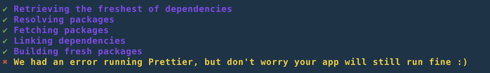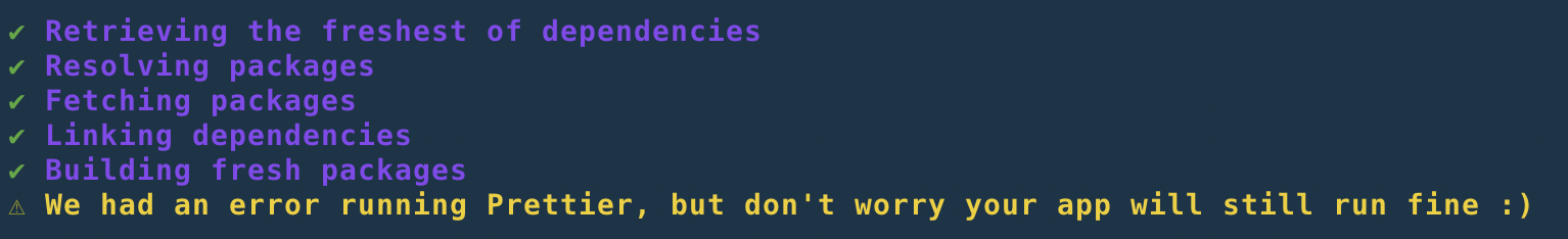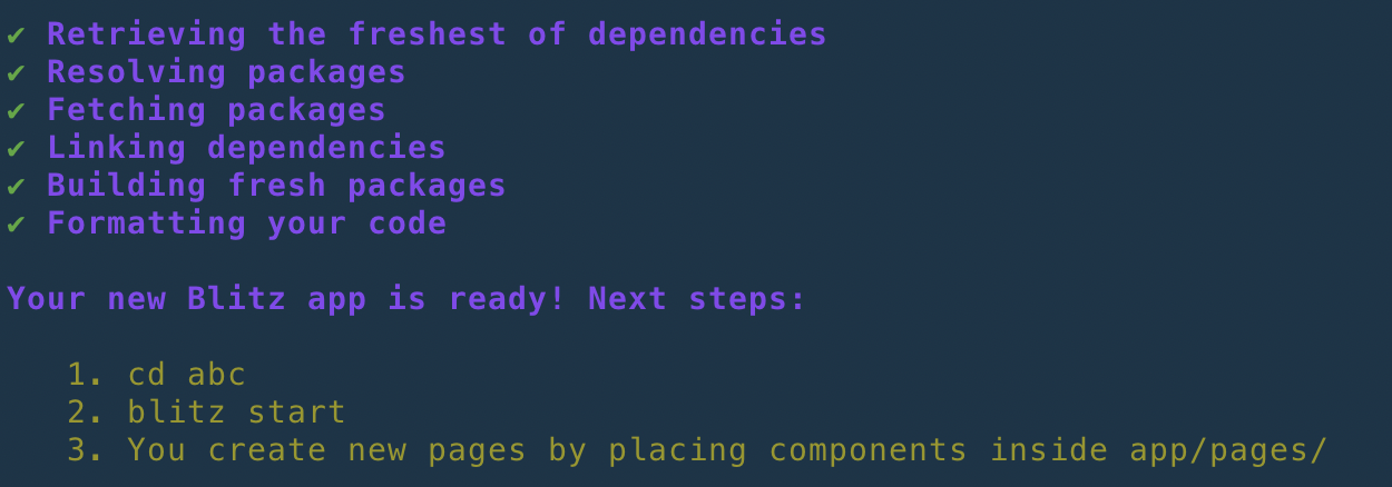 blitz new. I also removed the error that was previously thrown which prevented theYour new Blitz app is ready! Next steps:message from appearing. I think it makes sense to still show this message since a prettier failure doesn't prevent the app from running.Example of a successful run: