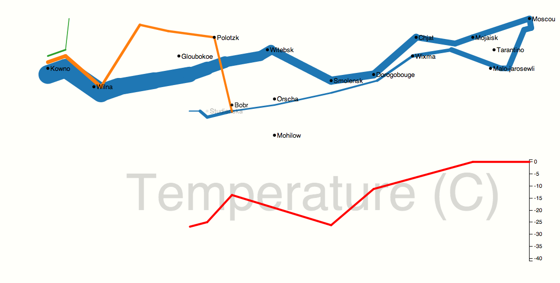 For a classical example, see how variable-width, staggered entry lines make it possible to reproduce Minard's famous Napoleon map in motion. Here's a screenshot, although the whole point is the animation.