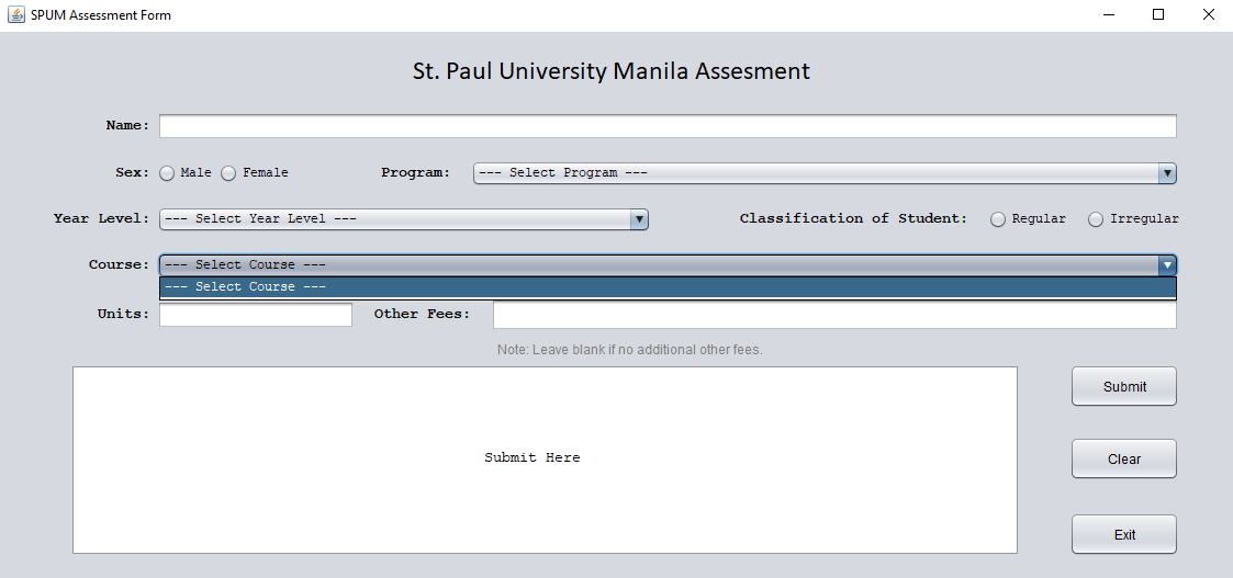 Midterms Output (Assessment Form) in Programming 2. Created using Java and Apache NetBeans.