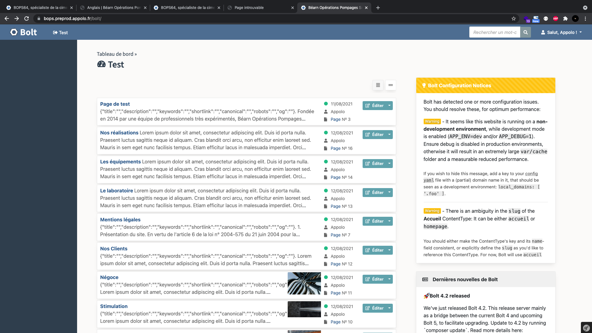 <admin-sidebar :menu="[{"name":"Tableau de bord","singular_name":null,"slug":null,"singular_slug":null,"icon":"fa-tachometer-alt","link":"\/bolt\/","link_new":null,"singleton":null,"type":null,"active":null,"submenu":null},{"name":"Contenu","singular_name":null,"slug":null,"singular_slug":null,"icon":"fa-file","link":null,"link_new":null,"singleton":null,"type":"separator","active":null,"submenu":null},{"name":"Accueil","singular_name":"accueil","slug":"accueil","singular_slug":"accueil","icon":"fa-home","link":"\/bolt\/content\/accueil","link_new":"\/bolt\/new\/accueil","singleton":true,"type":null,"active":false,"submenu":[]},{"name":"Pages","singular_name":"Page","slug":"pages","singular_slug":"page","icon":"fa-copy","link":"\/bolt\/content\/pages","link_new":"\/bolt\/new\/pages","singleton":false,"type":null,"active":true,"submenu":[{"id":3,"name":"BOPS64, sp\u00e9cialiste de la cimentation et de la stimulation de puits","link":"\/page\/bops64-specialiste-de-la-cimentation-et-de-la-stimulation-de-puits","editLink":"\/bolt\/edit\/3","icon":"fa-file"},{"id":16,"name":"Nos r\u00e9alisations","link":"\/page\/nos-realisations","editLink":"\/bolt\/edit\/16","icon":"fa-file"},{"id":14,"name":"Les \u00e9quipements","link":"\/page\/les-equipements","editLink":"\/bolt\/edit\/14","icon":"fa-file"},{"id":13,"name":"Le laboratoire","link":"\/page\/le-laboratoire","editLink":"\/bolt\/edit\/13","icon":"fa-file"},{"id":7,"name":"Mentions l\u00e9gales","link":"\/page\/mentions-legales","editLink":"\/bolt\/edit\/7","icon":"fa-file"}]},{"name":"Param\u00e8tres","singular_name":null,"slug":null,"singular_slug":null,"icon":"fa-wrench","link":null,"link_new":null,"singleton":null,"type":"separator","active":null,"submenu":null},{"name":"Configuration","singular_name":null,"slug":"configuration","singular_slug":null,"icon":"fa-sliders-h","link":"\/bolt\/menu\/configuration","link_new":null,"singleton":null,"type":null,"active":null,"submenu":[{"name":"Utilisateurs & Permissions","icon":"fa-users","editLink":"\/bolt\/users","active":null},{"name":"Configuration principale","icon":"fa-cog","editLink":"\/bolt\/file-edit\/config?file=\/bolt\/config.yaml","active":null},{"name":"Type de contenu","icon":"fa-object-group","editLink":"\/bolt\/file-edit\/config?file=\/bolt\/contenttypes.yaml","active":null},{"name":"Taxonomies","icon":"fa-tags","editLink":"\/bolt\/file-edit\/config?file=\/bolt\/taxonomy.yaml","active":null},{"name":"Param\u00e8tres du menu","icon":"fa-list","editLink":"\/bolt\/file-edit\/config?file=\/bolt\/menu.yaml","active":null},{"name":"Configuration du routage","icon":"fa-directions","editLink":"\/bolt\/file-edit\/config?file=\/routes.yaml","active":null},{"name":"Tous les fichiers de configuration","icon":"fa-cogs","editLink":"\/bolt\/filemanager\/config","active":null}]},{"name":"Maintenance","singular_name":null,"slug":"maintenance","singular_slug":null,"icon":"fa-tools","link":"\/bolt\/menu\/maintenance","link_new":null,"singleton":null,"type":null,"active":null,"submenu":[{"name":"Extensions","icon":"fa-plug","editLink":"\/bolt\/extensions","active":null},{"name":"Logs","icon":"fa-clipboard","editLink":"\/bolt\/logviewer","active":null},{"name":"API","icon":"fa-code","editLink":"\/bolt\/api","active":null},{"name":"Vider le cache","icon":"fa-eraser","editLink":"\/bolt\/clearcache","active":null},{"name":"Traductions","icon":"fa-language","editLink":"\/bolt\/_trans","active":null},{"name":"\u00c0 propos de Bolt","icon":"fa-award","editLink":"\/bolt\/about","active":null}]},{"name":"Gestion de fichiers","singular_name":null,"slug":"filemanagement","singular_slug":null,"icon":"fa-folder-open","link":"\/bolt\/menu\/filemanagement","link_new":null,"singleton":null,"type":null,"active":null,"submenu":[{"name":"Fichiers t\u00e9l\u00e9charg\u00e9s","icon":"fa-archive","editLink":"\/bolt\/filemanager\/files","active":null},{"name":"Afficher et modifier les mod\u00e8les","icon":"fa-scroll","editLink":"\/bolt\/filemanager\/themes","active":null}]}]" :version="'4.2.1'" :about-link=""\/bolt\/about"" :labels="{"toggler":"Basculer la largeur de la barre lat\u00e9rale","action.new":"Nouveau","action.view":"Vue"}"></admin-sidebar>