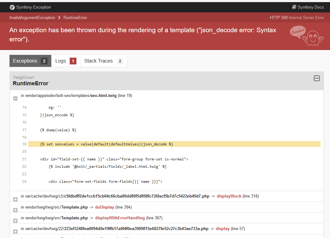 make db-resetwith the appolodev/bolt-seo extension results in the following error on the dashboard when trying to view the contenttype using said extention.It looks fixtures are not properly stored/saved in the SEO field. The extension is expecting a json type format. Bolt saves fixtures to the field as a 'normal' string type.