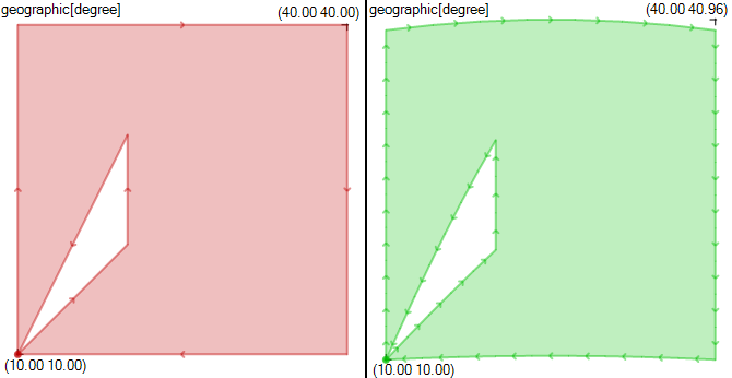Note that this is simple visualization in the coordinates space. This is why the red polygon above has straight edges (same as the green one). The library may treat them as geodesic segments depending on passed strategy. Because more points were added the edges looks like curved lines in case of green polygon.