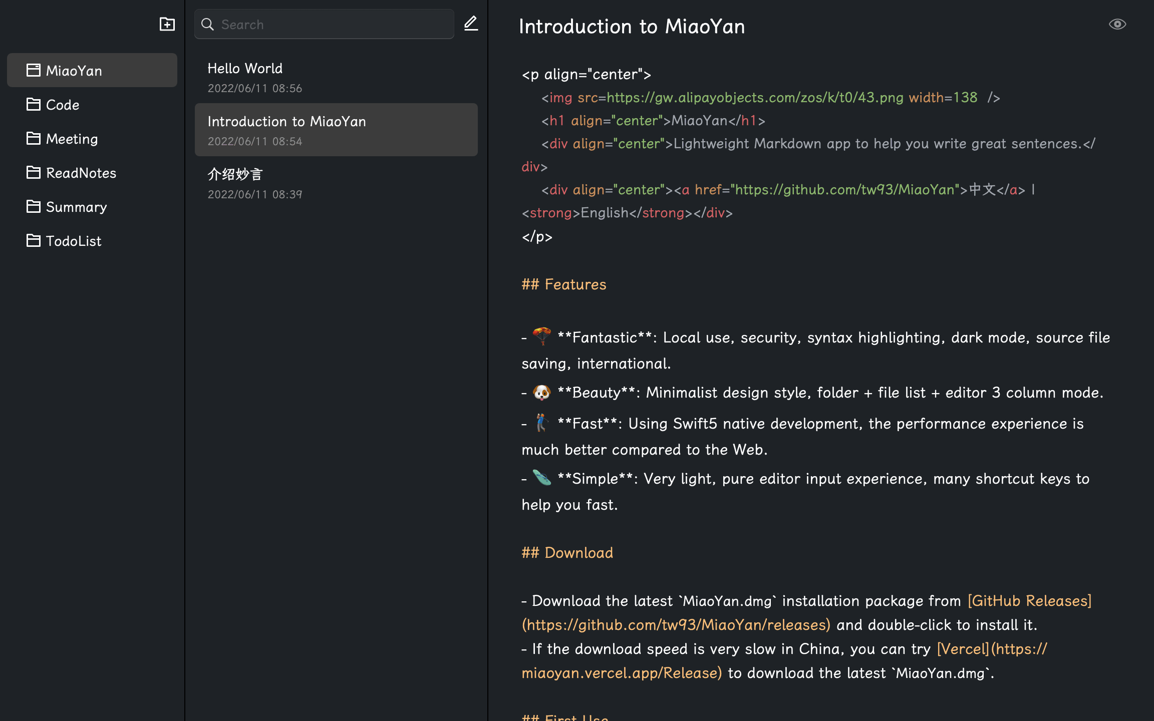 - 🎊 Beauty: Minimalist design style, folder + file list + editor 3 column mode.