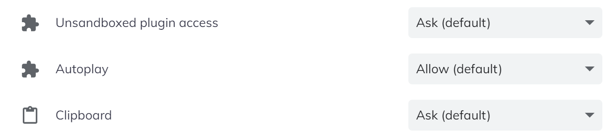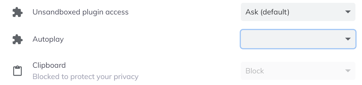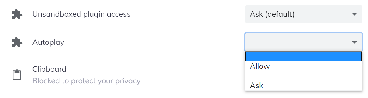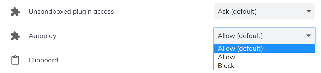 Site settings' Autoplay dropdown selector doesn't show any value by default and when clicked "Block" value is not listed, instead there is a blank line.