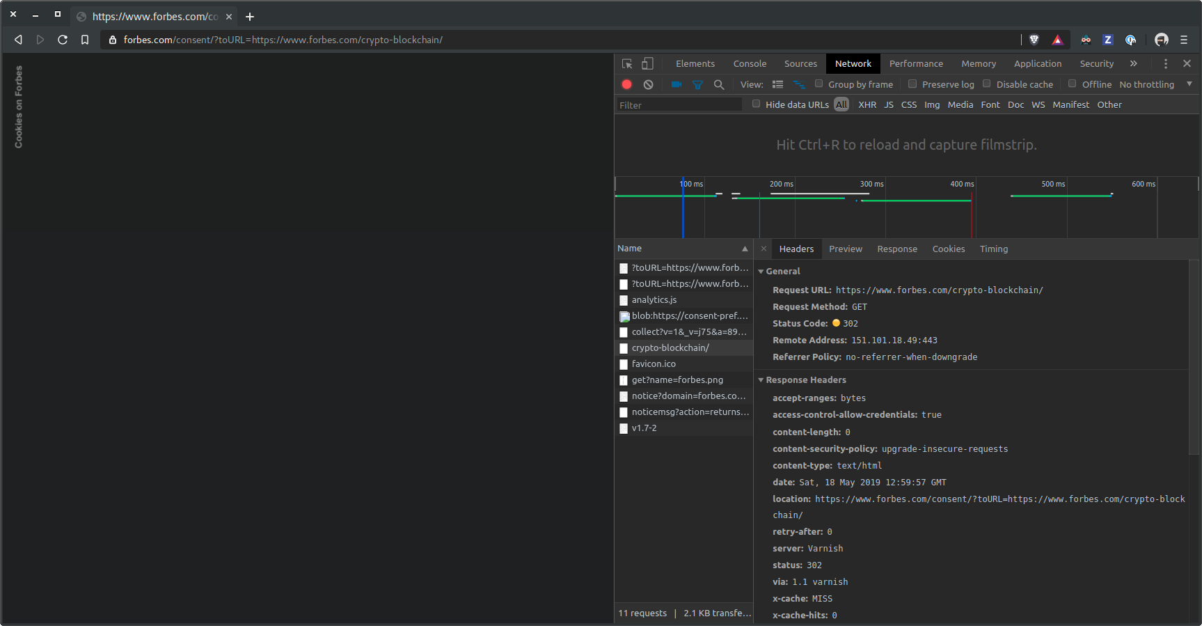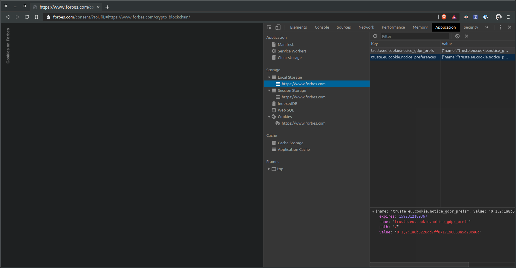When visiting https://www.forbes.com/crypto-blockchain/ the browser just shows an empty page which has "cookies on Forbes" on the left hand side. I have checked in other browsers and it is a problem that is only applicable to Brave.