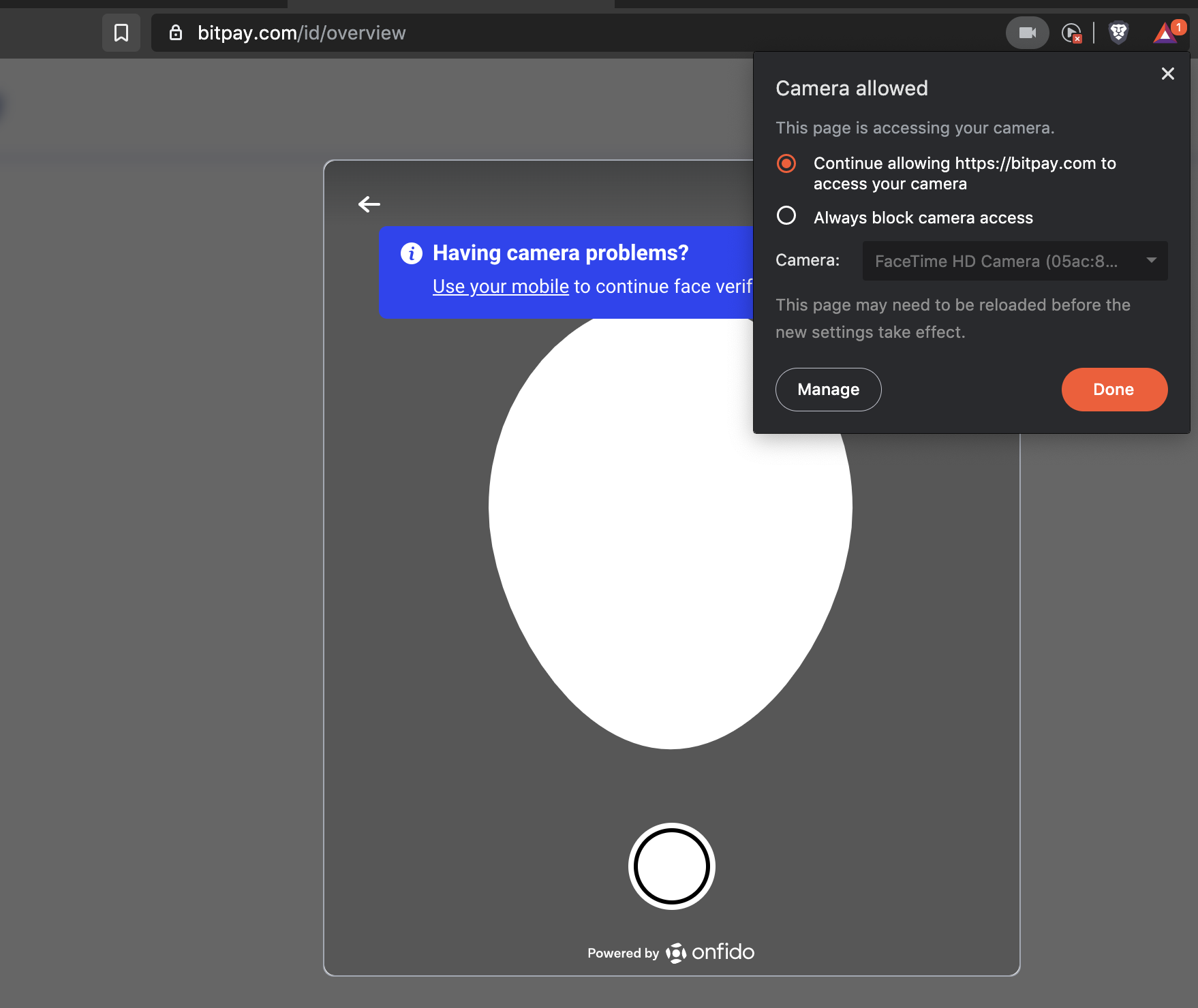 Sign upCamera access doesn't work in Brave even with shields down (Bitpay) #7311