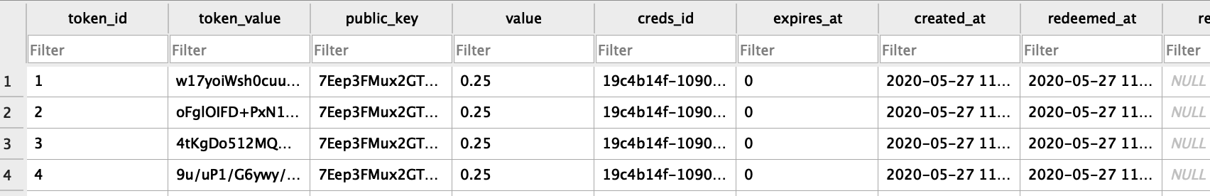 unblinded_tokenstable mark some tokens as redeemed. (you do this with setting timestamp inredeemed_atcolumn)t's)Reviewer Checklist: