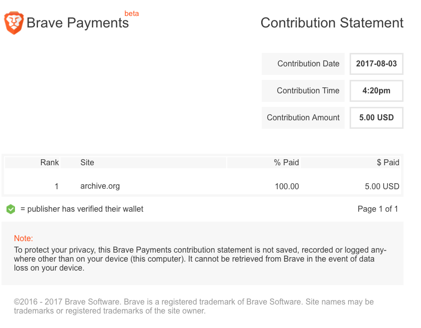 All my Brave contribution statements show $5 going to a single site. For instance this is the August contribution statement:
