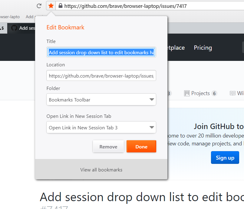 Adds a session selector to the add/edit bookmark dialog. When opened in a new tab the bookmark will be opened in the selected session.